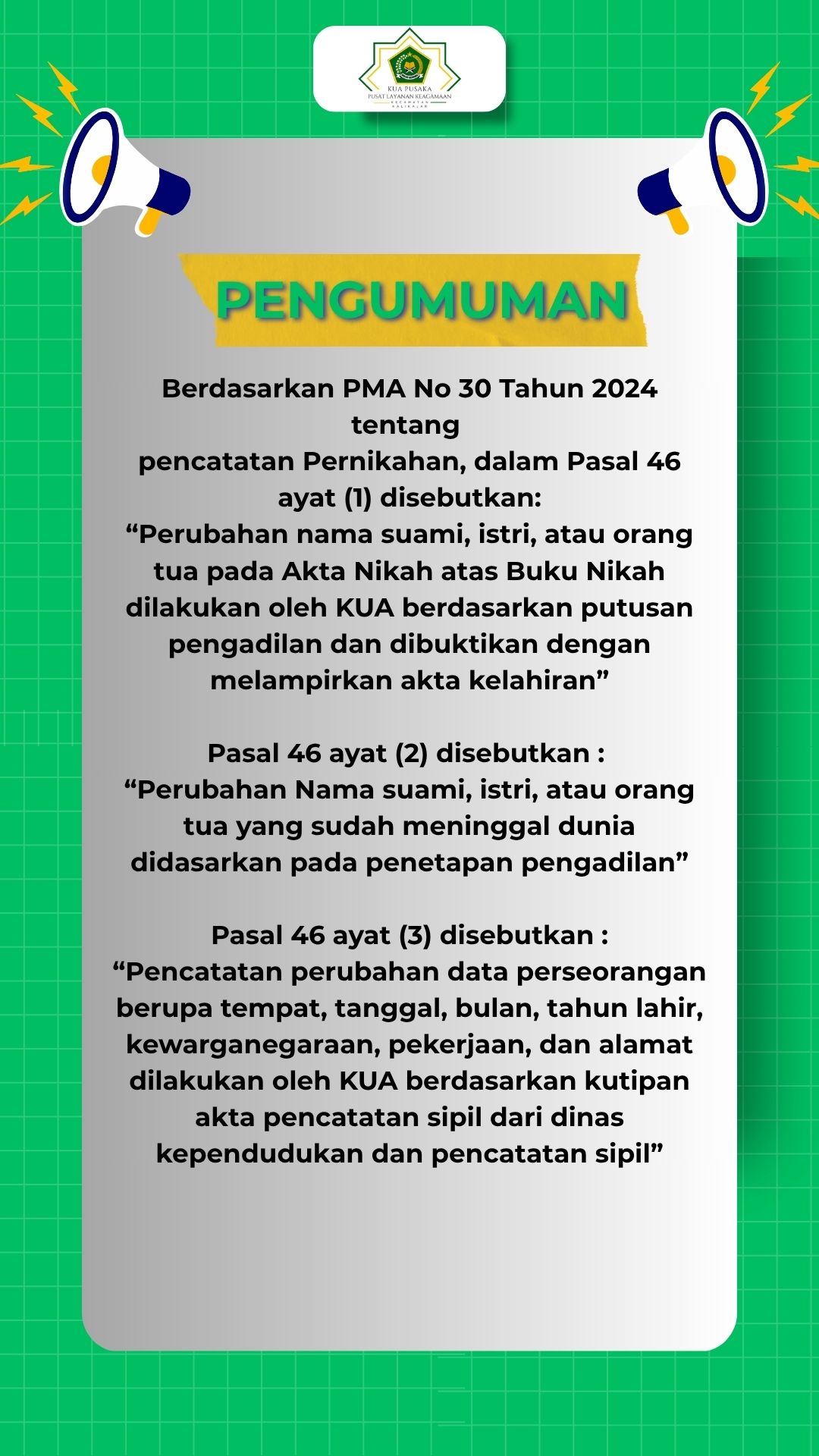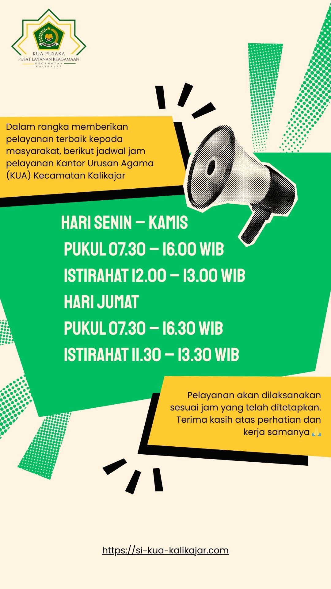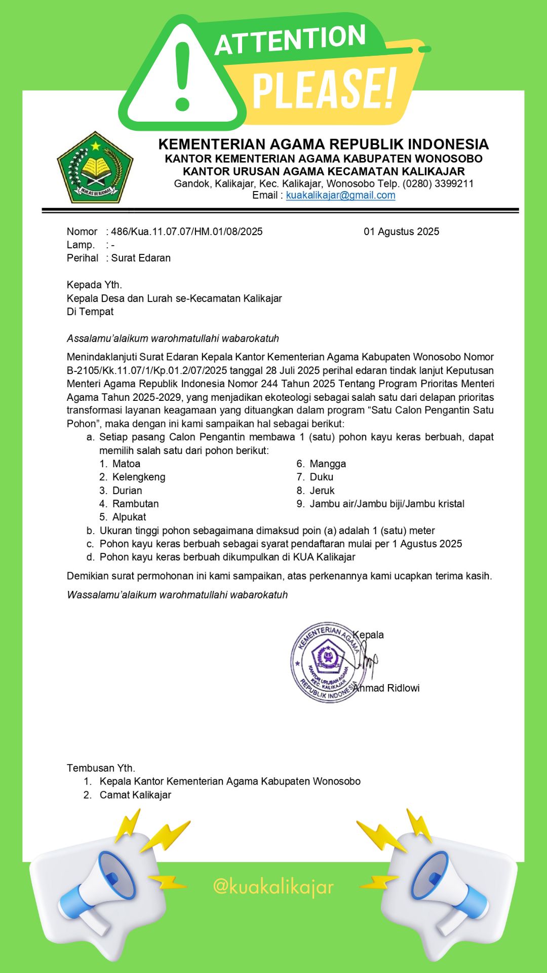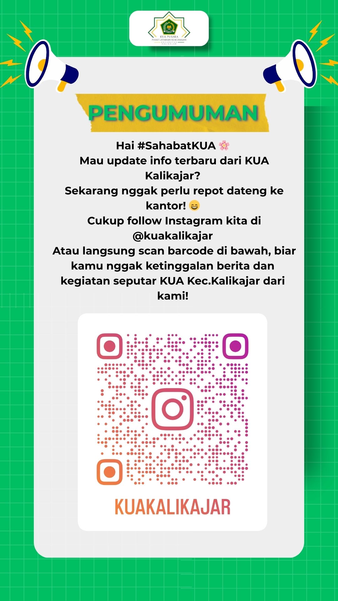 Website ini bukan website resmi. Website ini dibuat sebagai inisiatif pribadi untuk memudahkan masyarakat memperoleh informasi seputar layanan KUA Kecamatan Kalikajar Kabupaten Wonosobo.Situs ini tidak menggantikan website resmi Kementerian Agama.